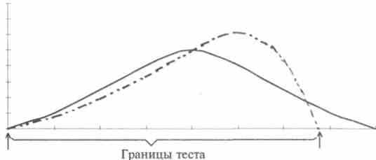 Очевидно, что на основании таких данных нельзя делать вывод об аномальном распределении умственных способностей среди детей или студентов колледжа. Скошенное распределение, полученное в этих случаях, будет свидетельствовать о том, что уровень сложности теста не включает в себя в равной мере более сложные и более простые задания. В одном случае все испытуемые покажут очень высокие значения, в то время как, если бы тест включал в себя вопросы посложнее, результаты испытуемых распределились бы по всей шкале и более равномерно. Иллюстрацией к этому может служить рисунок 15, на котором сплошная линия показывает реальное распределение способностей в группе, а пунктирная линия — результат использования теста с низким уровнем сложности. Подобным образом, боль-