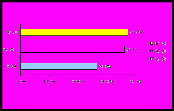 По возрастным категориям респонденты распределились следующим образом: заемщики в возрасте от 40 до 60 лет составляют 39%, заемщики в возрасте от 30 до 39 лет – 29,7%, а в возрасте от 18 до 29 лет – 31,3%, то есть клиенты в возрасте до 40 лет составляют 61% (диаграмма 27). Сравнение с возрастной категорией клиентов Сбербанка, возраст которых до 40 лет составляет 26,6% против 54,6% клиентов старшего возраста, и возрастной категорией клиентов банка «Центр-Инвест», возраст которых до 40 лет – 63,2% против 37,3% клиентов старшего возраста, дает основание для вывода, что люди среднего возраста в большей степени доверяют государственным финансовым учреждениям.