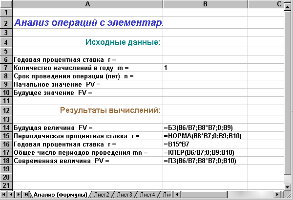 На рис. 1.3 приведен простейший пример шаблона, позволяющий решать типовые задачи по исчислению параметров финансовых операций с элементарными потоками платежей. На рис. 1.4 этот шаблон приведен в режиме отображения формул. Дадим необходимые пояснения.