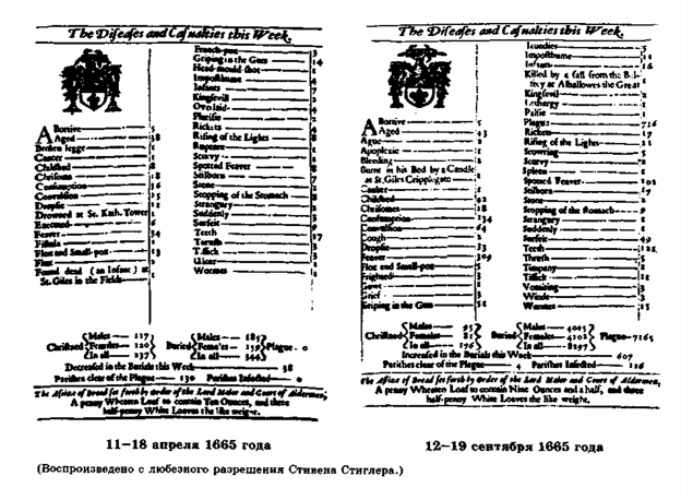 В списках указывалась причина смерти и число умерших, и из того же источника Грант почерпнул еженедельные сведения о крестинах детей. На иллюстрации представлен документ за две недели 1665 года1* (Для оценки стоимости жизни служили данные о количестве хлеба, которое можно было купить на пенни. В наше время для этого используют корзину товаров и услуг). Из документа следует, что только за одну неделю с 12 по 19 сентября умерли от чумы 7165 человек и всего четыре из 130 приходов эта болезнь миновала11.