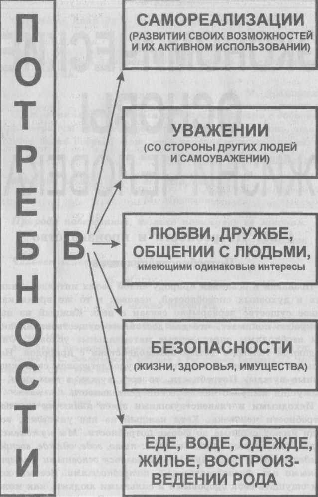 Потребности людей, как видите, разнообразны. Но их можно привести в систему. Американский социолог Абрахам Маслоу предложил пирамиду потребностей и желаний человека, которую можно представить в виде следующей схемы: