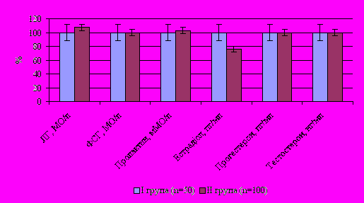 Після проведеної метаболічної корекції у дівчат основної групи нормалізувався вміст естрогенів у першу фазу менструального циклу, зокрема концентрація естрадіолу збільшилася на 23,2%. Водночас відбувалися зміни у відношенні вмісту у сироватці крові лютеінізуючого гормону під час другої фази менструального циклу, концентрація якого знизилася з 13,23,1 МО/л до 12,12,8 МО/л, тобто поряд із зниженням середніх значень показника (-8,3%) відбулося суттєве зменшення його дисперсії.