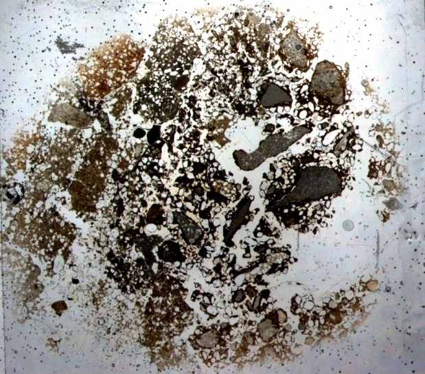 | Геотехногенный субстрат, или свалочный грунт Крупные антропогенные включения занимают основную площадь шлифа (30-50% и более) - гетерогенная масса мусорного «меланжа» (и-м). Отмечаются следы механического перемешивания искусственного и почвенного субстрата (к-м). Следы биологических процессов почвообразования не отмечаются. Макроморфологический анализ устанавливает отсутствие структуры. Субстрат не занят растительностью даже на участках, свободных от мусора. | ![]() и | ![]() к |