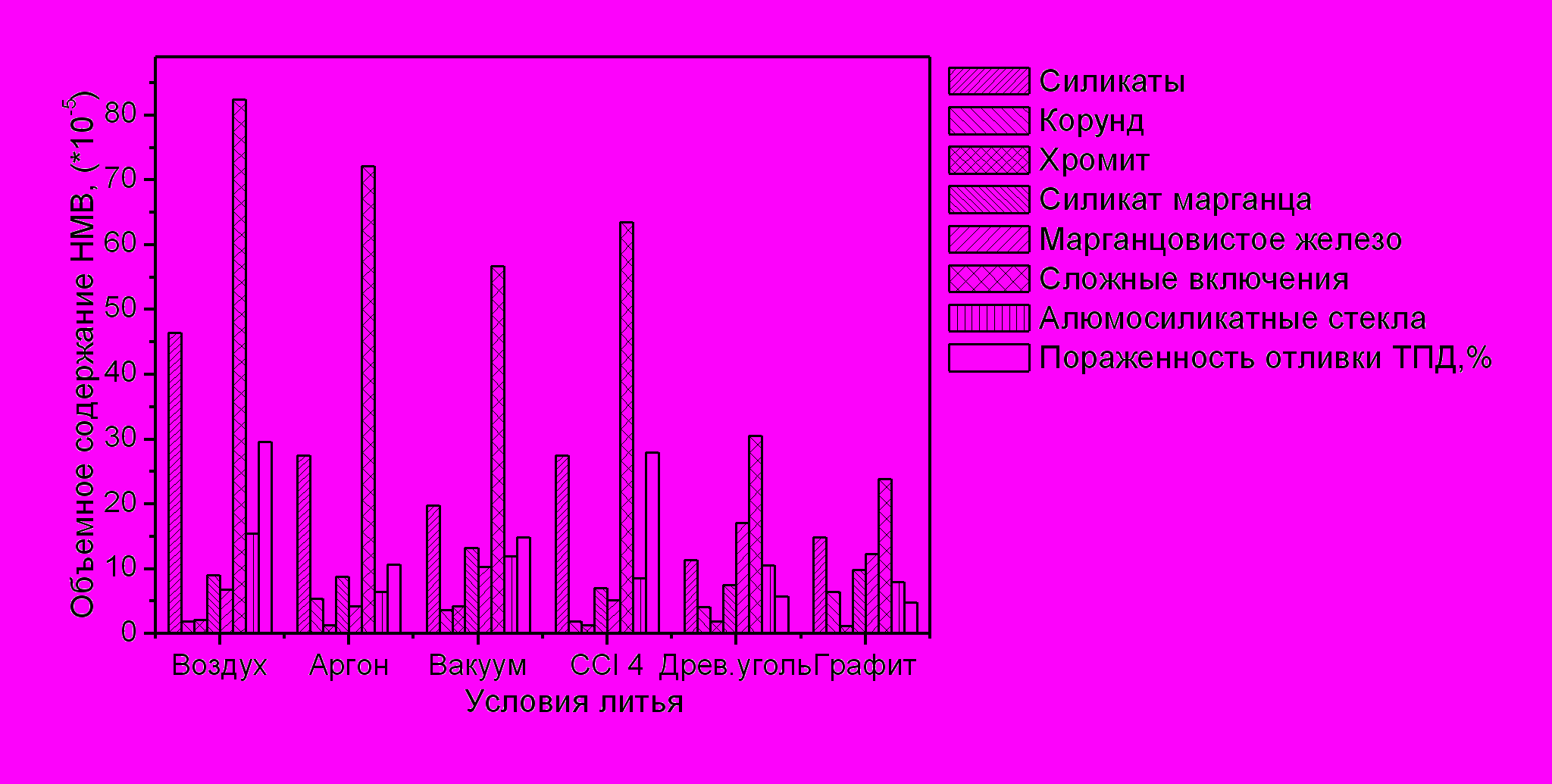 4.Показано, что заливка металла и охлаждение отливки в восстановительной атмосфере, создаваемой за счет ввода углеродосодержащих добавок в состав формы позволяет получить отливки с минимальной пораженностью ТПД и одновременно низким содержанием макро- и микровключений в отливке.