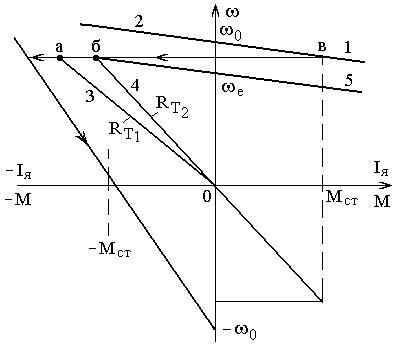 ) и (1.20) видим, что характеристики проходят при Iя = 0 через ωо и ЭМХ ДПТ НВ в режиме рекуперативного торможения являются продолжением двигательного режима. Например, при снижении напряжения на обмотке якоря ДПТ НВ наблюдается генераторное торможение (рис.5, характеристика 5 выше скорости идеального холостого хода до т. б).