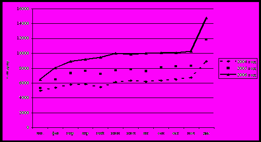 Нестабильность в текстильном производстве связана как с сезонностью потребления, так и с изменениями платежеспособного спроса населения и предприятий. На графике (рис.2) представлена динамика реальных доходов населения в рублях в 2004 -2006 годах. Среднемесячная заработная плата работающих в отрасли за 11 месяцев 2006 года возросла в текстильном и швейном производстве на 20,8%.