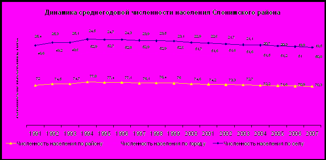 Одной из важнейших интегральных характеристик общественного здоровья является медико-демографическая компонента. Изменение демографической структуры населения в направлении развития депопуляционных процессов произошло в Слонимском районе в 1993 году. Как в целом по области и республике медико-демографическая ситуация характеризуется уменьшением численности населения, отрицательным естественным приростом, снижением средней продолжительности предстоящей жизни. В 2007 году продолжалось сокращение численности населения района. Численность населения на начало 2008 года составила 70,0 тыс. человек против 70,6 тыс. на начало 2007 года (снижение на 0,6 тыс. или 0,9%). Среднегодовая численность населения района за 2007 год составила 70,3 тыс. человек против 70,9 тыс. в 2006 году.