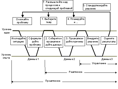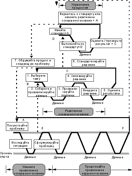 Единственный стандартный процесс для реактивного совершенствования (7 ступеней QC) был описан в главе 5. В этой статье нет консенсуса о единственной модели, соответствующей для проактивного совершенствования. Стандартная версия модели WV показывает проактивный процесс, ведущий в реактивное совершенствование (рис. 7-5).