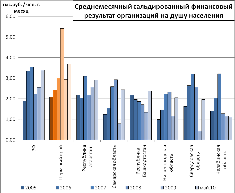Сальдированный финансовый результат за 2005-2010 гг. вырос на 90,5%. Среди регионов-конкурентов Пермский край лидирует по среднедушевому сальдированному финансовому результату.