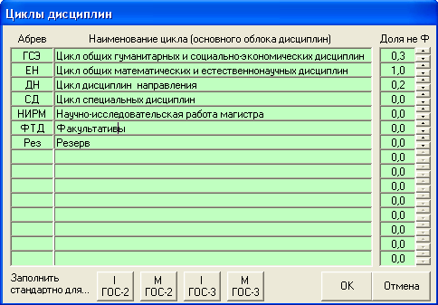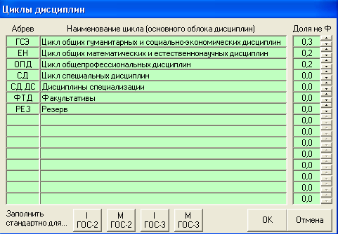 Условимся папку, в которую произведена установка пакета GosInsp, называть личной (пусть это папка называется так же, GosInsp). Личной корневой папкой РУП для специалистов очной и очно-заочной форм обучения будем называть папку GosInsp\IPlany, для РУП бакалавров и магистров это папка GosInsp\MPlany. Как уже было упомянуто в предыдущем абзаце в этой папке сохраняются файлы планов с маской «*.pli», «*.plm».Циклы дисциплин (Рисунок 3 , Рисунок 4) могут именоваться в соответствии со спецификой групп специальностей. Соответственно определяются их аббревиатуры и допустимая доля часов на дисциплины национально-регионального и выборного компонентов.