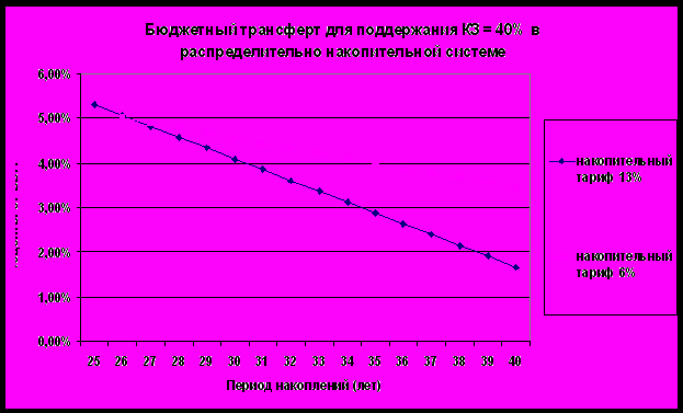 Как видно из графика, накопительная составляющая позволяет расти коэффициенту замещения. Если требование достижения коэффициента замещения в 40% станет гарантированным обязательством государства, то существующая пенсионная система, за счет накопительной составляющей, будет постепенно сокращать свою зависимость от федерального бюджета, в то время как чисто распределительная система эту зависимость будет в лучшем случае не увеличивать.