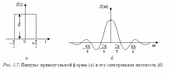 . Эта функция имеет вид, показанный на рис. 1.7 б. Спектральная плотность прямоугольного импульса