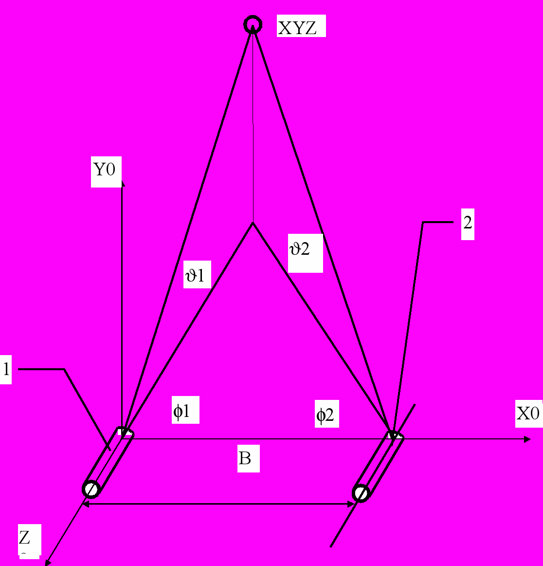 По измеренным углам визирования и известной величине базового расстояния B между реперными точками определяются координаты XYZ контролируемой точки в приборной системе координат X0Y0Z0.