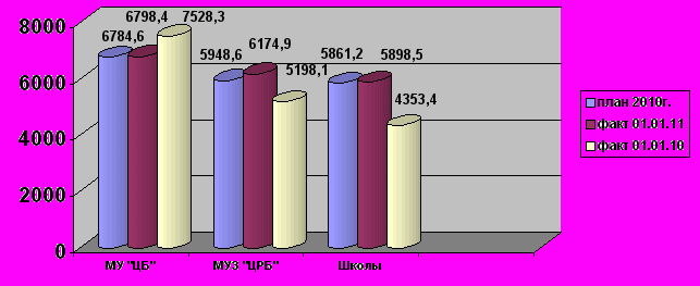 Источником дохода от оказания платных услуг МУ «ЦБ» является родительская плата в дошкольных учреждениях, плата за путевки в детские оздоровительные лагеря, а также стоимость входных билетов на дискотеки. Доходы за 2010 год по сравнению с прошлым годом уменьшились на 729,9 тыс.рублей за счет снижения количества реализованных путевок в детский оздоровительный лагерь. План по доходам от оказания платных услуг здравоохранением определен в размере 5948,6 тыс. рублей и исполнен в сумме 6174,9 тыс.рублей, что на 976,8 тыс.рублей больше, чем в прошлом году. Это связано с погашением задолженности по медосмотрам организациями, увеличением объема мед. освидетельствования водителей, увеличением стоимости оказываемых услуг. Источник доходов от оказания платных услуг школами – родительская плата. Фактически за 2010 год поступило 5861,2 тыс.рублей, что на 1545,1 тыс.рублей больше аналогичного периода прошлого года. Это связано с повышением стоимости обедов и завтраков и увеличением количества питающихся школьников.