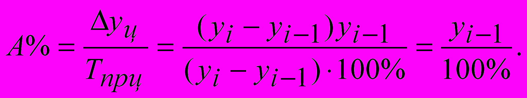 Вычисляется отношением базисного абсолютного прироста Δyб на уровень, принятый за постоянную базу сравнения y0 – базисный темп прироста или отношением сравниваемого цепного абсолютного прироста Δyц к предыдущему уровню yi-1.