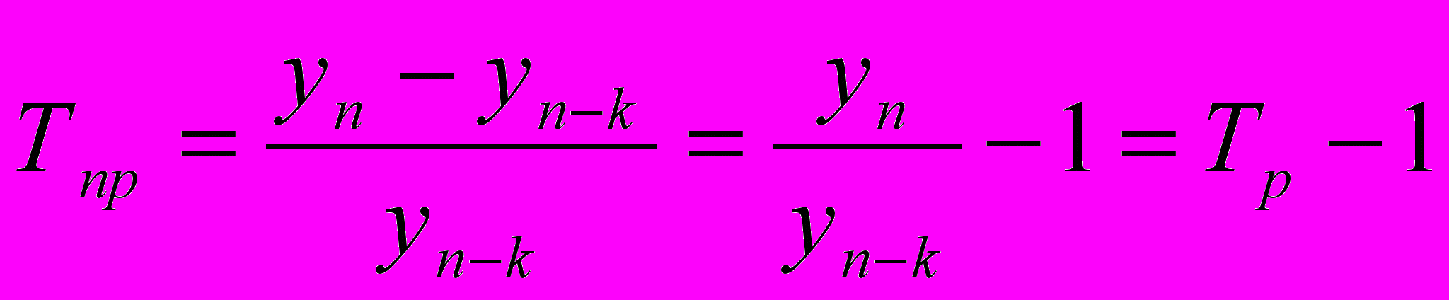. При k=1 Тр - цепные, а при k≠1 - базисные. Темпы роста выражаются в коэффициентах и в процентах.Темп прироста (Тпр) показывает на какую долю (или %) уровень текущий больше (или меньше) базисного уровня