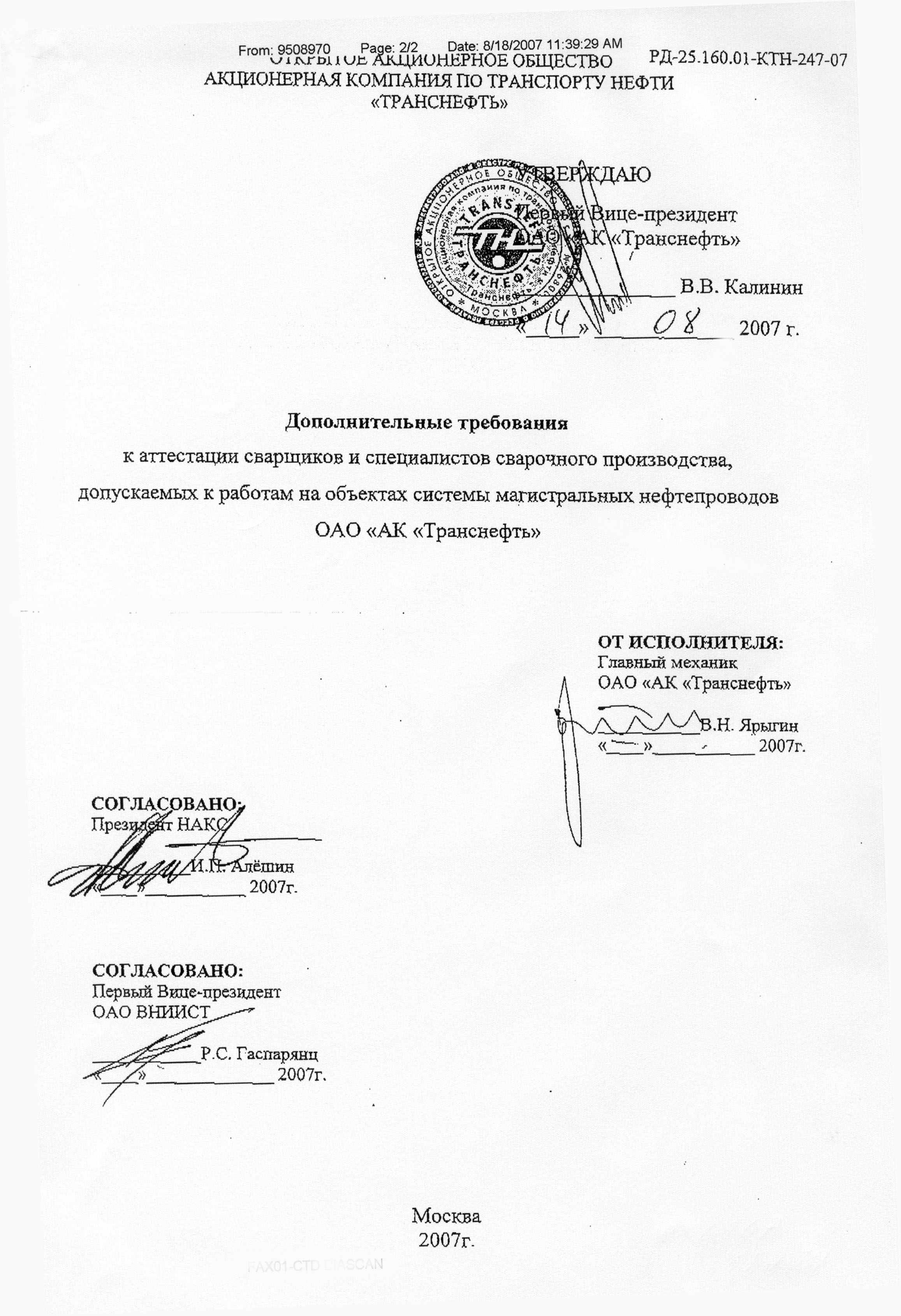- Положения настоящих «Дополнительных требований к аттестации сварщиков и специалистов сварочного производства, допускаемых к работам на объектах системы магистральных нефтепроводов ОАО «АК «Транснефть», обязательны для всех структурных подразделений ДАО МН ОАО «АК «Транснефть» и сторонних подрядных организаций, сварщики и специалисты сварочного производства II-IV уровней которых привлекаются к проведению работ на объектах системы МН ОАО «АК «Транснефть».