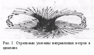 В вихревой системе, называемой циклоном (рис. 1), атмосферное давление понижается от периферии к центру. Поэтому вблизи поверхности Земли воздушные течения направлены к центру циклона. Все циклоны имеют вращательную составляющую скорости ветра, В Северном полушарии она направлена против часовой стрелки, в Южном - по часовой. В развивающихся циклонах (т. е. таких, у которых давление в центре продолжает падать) наблюдаются восходящие потоки. При этом образуется мощная облачность и выпадают осадки,
