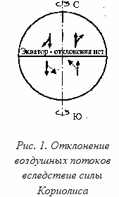 Воздух поглощает солнечное излучение, и эта тепловая энергия частично переходит в кинетическую энергию движения потоков воздуха. Но воздух, как любое физическое тело, испытывает влияние вращения планеты: траектория его движения искривляется. Воздушные массы в Северном полушарии отклоняются от направления первоначального движения вправо (рис. 1), а в Южном - влево. Направление движения воздуха определяется также центробежной силой и силой тяжести. Определенную роль играет и сила трения, изменяющаяся в зависимости от шероховатости подстилающей поверхности.