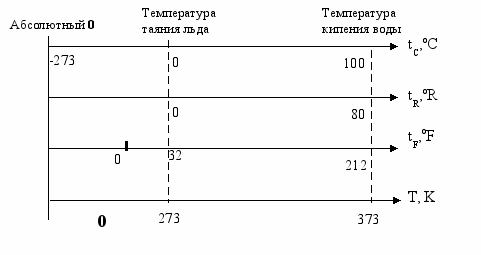 Если совместить все названные нами шкалы, то получится схема, указанная на рисунке. Здесь: температуре таяния льда соответствуют 0 оC, 0 °R, 32 °F, 273 К;