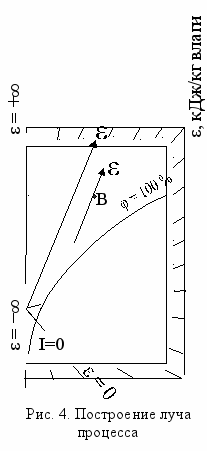 - Процесс адиабатного увлажнения воздуха. Влажный воздух поглощает влагу (d4 > d1) при неизменной энтальпии I4 = I1. Луч процесса ε = 0 направлен по линии I = const (линия 1-4). Адиабатное увлажнение широко применяется в системах кондиционирования, в частности, в оросительной камере, где с помощью форсунок производится распыление воды. Температура испаряемой воды постепенно устанавливается равной температуре воздуха по мокрому термометру tм. Воздух, находясь в контакте с водой, имеющей температуру tм, теряет явную теплоту, которая затрачивается на испарение воды. В то же время воздух получает такое же количество скрытой теплоты с водяными парами. Практически в камере орошения удается увлажнить воздух до φ = 90…95%.