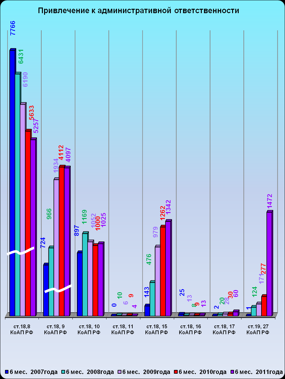 Совместно с органами внутренних дел составлено 14142 протоколов, что на 6,3% больше, чем в прошлом году (АППГ -13302). За различные нарушения миграционного законодательства, выявлено сотрудниками УФМС области и привлечено к административной ответственности 13270 человек (АППГ - 12332, +7,6 %), из них: 6923 - ИГ и ЛБГ по статьям 18.8, 18.10, 18.11,18.17.2, 19.27.1 КоАП РФ (АППГ 6819; +1,5 %), физических лиц - 6052 (АППГ-5230; 15,7 %), должностных лиц- 207 (АППГ-224; -7,6 %), юридических лиц – 80 (АППГ-54, +48,1%), ПБЮЛ - 8 (АППГ-5, +60%).