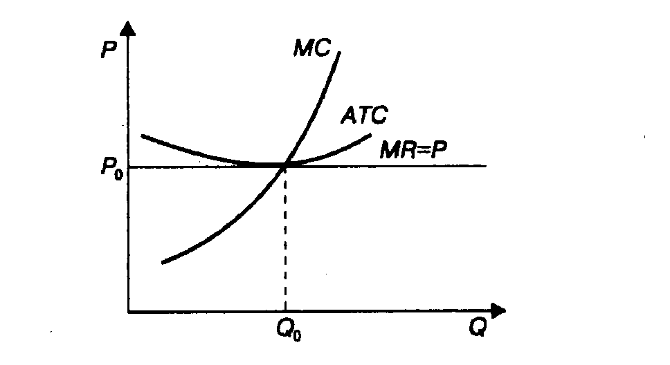 Равновесие на рынке будет достигнуто, когда у фирм не будет стимулов как для входа в отрасль, так и для выхода из нее. Это достигается при условии, если рыночная цена установится на уровне минимума средних валовых издержек и экономическая прибыль, таким образом, исчезнет.
