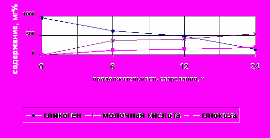 В первые часы после убоя происходит значительный распад гликогена с образованием молочной кислоты. Так, после 6 часов созревания свинины количество гликогена составляет 14 мг%, молочной кислоты 451,8 мг%. При дальнейшем созревании происходит незначительное накопление молочной кислоты (457,7 мг%) и глюкозы (82,4 мг%). Таким образом, послеубойные изменения свинины контрольной группы свидетельствует о мясе с PSE-свойствами.