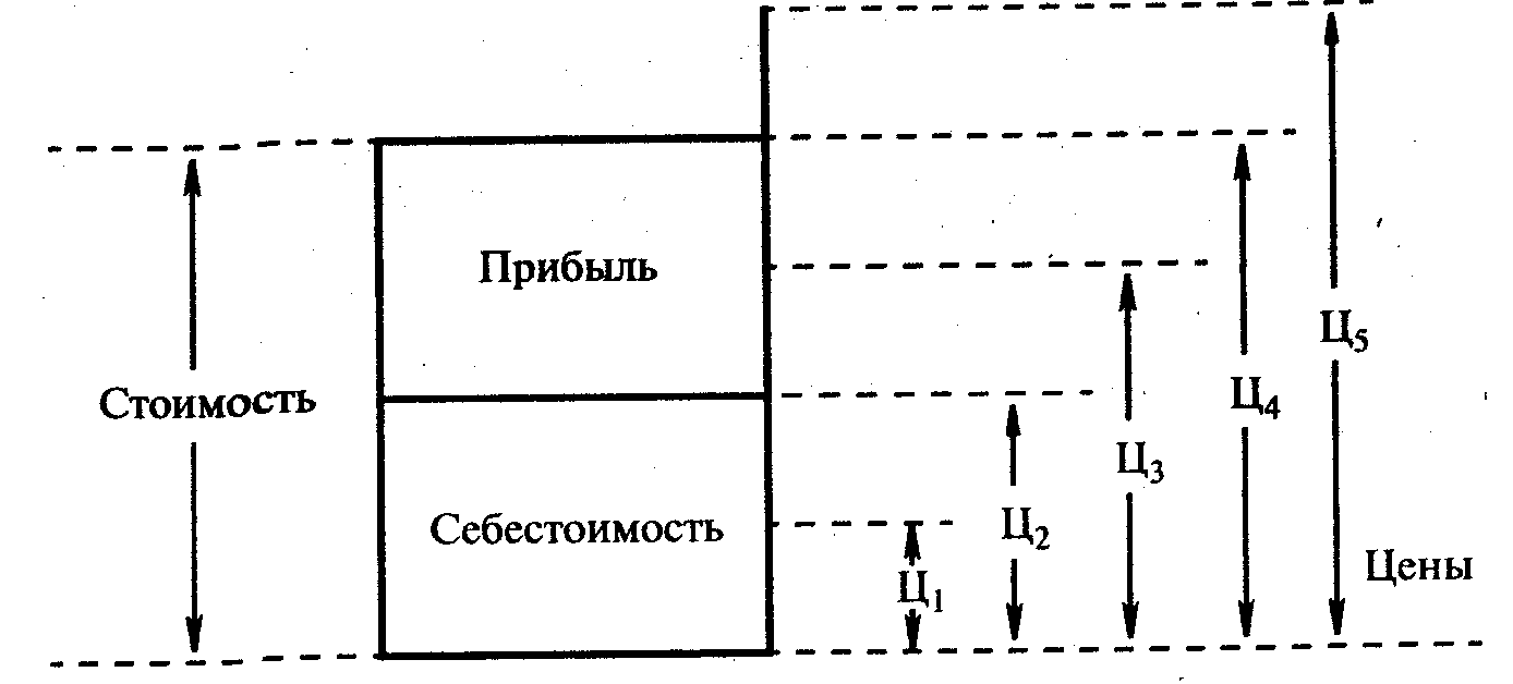 В-третьих, когда цена (Ц3) выше себестоимости и ниже стоимости, то предприятие получает прибыль в меньшем размере, чем величина заключенной в товаре прибыли. В-четвертых, в случае совпадения уровня цены (Ц4) со стоимостью бизнесмен получает всю прибыль, заключенную в товаре. Наконец, если рынок позволяет получать за товар больше денег (Ц5), чем величина стоимости, то бизнесмен получает сверхприбыль, а общая величина его дохода превосходит объем созданной прибыли.
