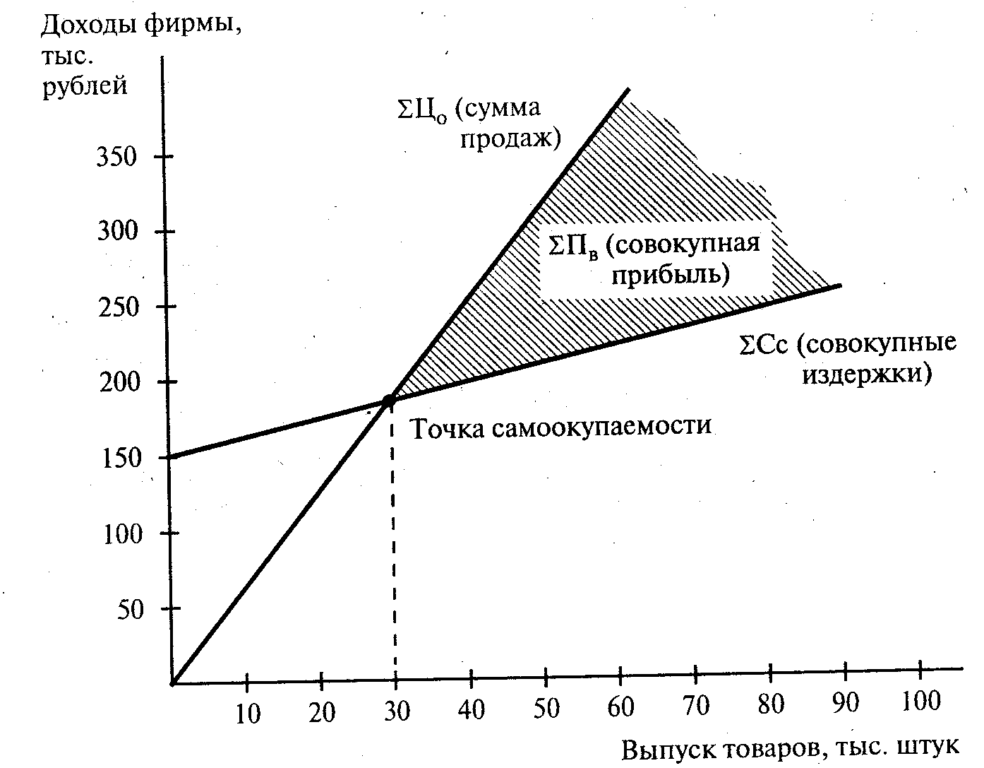 Затем наступает такой момент, когда сказывается эффект увеличения масштабов производства: при росте выпуска изделий себестоимость каждого из них будет снижаться (из-за экономии постоянных затрат в расчете на единицу продукции). Сначала сумма продаж сравняется с величиной совокупных издержек (Сс), то есть будет достигнута точка самоокупаемости производства. В дальнейшем наращивание выпуска товаров приведет к образованию и увеличению валовой прибыли. Наглядной иллюстрацией такого процесса служит рис. 11.3 (цифры условные).