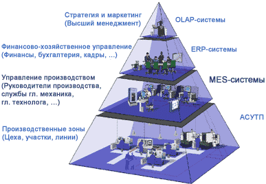 Таким образом, MES-системы, собирая и обобщая данные, полученные от различных производственных систем и технологических линий (нижний уровень пирамиды), выводят на более высокий уровень организацию всей производственной деятельности, начиная от формирования производственного заказа и до отгрузки готовой продукции на склады.