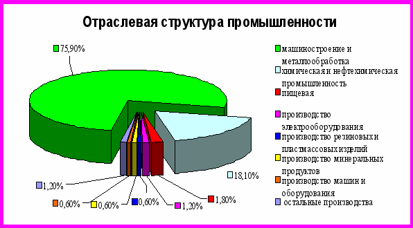 В структуре промышленного производства наибольший вес занимает продукция машиностроения и металлообработки – 75,9 %, из них: отгрузка легковых автомобилей — 71,5 %; отгрузка частей и принадлежностей автомобилей и их двигателей — 28,2 %; от общего объема производимой промышленной продукции. Доля химической и нефтехимической промышленности – 18, 1%, пищевой – 1,8%; производство электрооборудования — 1,2 %; производство резиновых и пластмассовых изделий — 0,6 %; производство минеральных продуктов — 0,6 %; производство машин и оборудования — 0,6 %; остальные производства не превышают 0,5 % и в сумме составляют 1,2 процента.
