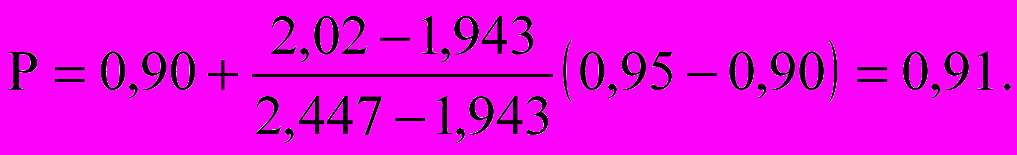 По табл.1 замечаем, что при =6 значение tp,=2,02 лежит между значениями 1,948 (в столбце с Р=0,90) и 2,447 (в столбце с Р=0,95). Линейной интерполяцией находим значение Р, соответствующее tp,=2,02.