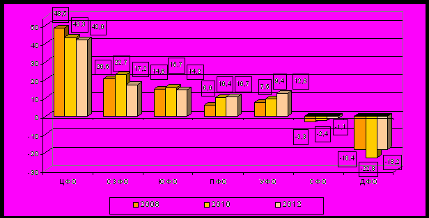 Наиболее интенсивный миграционный приток в прогнозном периоде характерен для Московской (110,5 промилле в 2010 году и 104,5 в 2012 году) и Ленинградской областей (79,1 и 86,9 промилле соответственно), что определяется непосредственной близостью данных регионов к городам федерального значения при относительно доступных условиях для проживания.