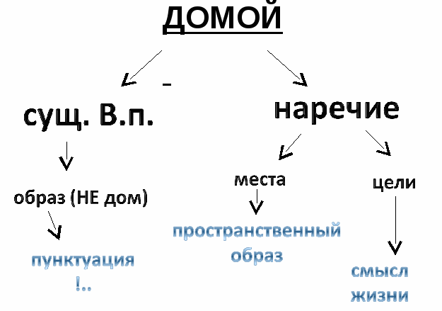 Стоит заметить, слово «домой» в зависимости от контекста может выступать в роли наречия места (цели) или существительного в Винительном падеже. В данном случае ключевое слово заглавия выступает с одной стороны, в роли наречия места, так как любой дом имеет пространственный образ. И это не случайно, ведь именно образ места раскрывается на протяжении всего произведения. Именно образ, а не место - ДОМ, ведь пунктуация (в виде восклицательного знака в совокупности с многоточием) в конце заглавия задает темп, динамику сюжету и в то же время умолчание добавляет некую статичность, тупик, преграду, не давая свободу действий. А с другой стороны, это же слово можно рассматривать как наречие цели, потому что для героев основной смысл жизни – найти свой дом, а поиски смысла – это и есть цель. Даже не читая произведение, можно рассматривать такую ситуацию – желание что-то изменить и отсутствие такой возможности – зависимость от обстоятельств и внутренней ограниченности ресурсов. Такой парадокс создает конфликт произведения и выводит читателя на путь понимания сути произведения.