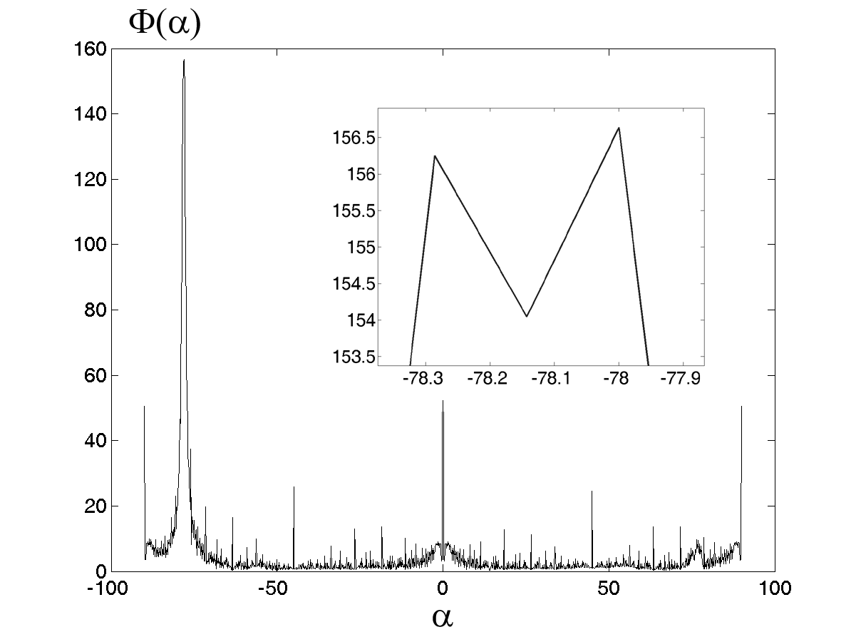- угловая точность оценки.Функция углового распределения, соответствующая перспективной проекции куба представлена на рис. 1б. Как видно из рисунка, преобладающие локальные максимумы размещены в группы, примерно по 2 элемента в группе. Каждая группа соответствует углу наклона соответствующих ребер.