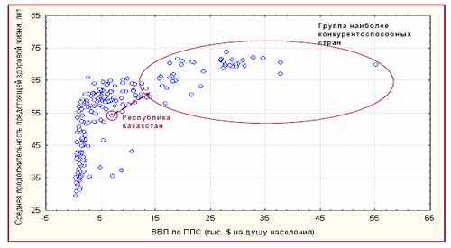 Казахстан занимает 80 место в рейтинге стран по индексу развития человеческого потенциала (ИРЧП). Положение Республики Казахстан среди основных стран мира по таким составляющим этого индекса, как средняя продолжительность предстоящей здоровой жизни и величина валового внутреннего продукта на душу населения, иллюстрируется рисунком 2.