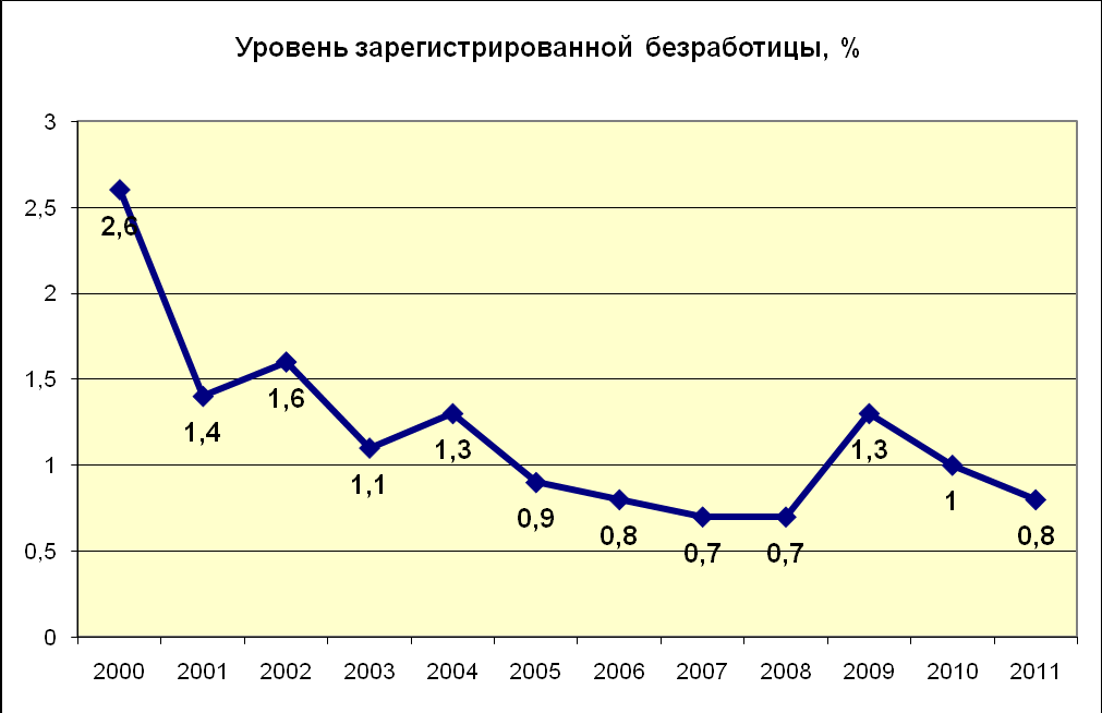 Численность зарегистрированных безработных на 1 января 2012 года составила 1 231 человек, что на 289 безработных меньше, чем на начало предыдущего года. Уровень зарегистрированной безработицы снизился за год с 1,03% до 0,82%.