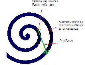 «В начале 90-х годов Россию посетил Филипп Котлер. Когда его спросили, сможет ли РФ догнать Запад в сфере маркетинга, тот, помолчав, ответил – «Ну вы понимаете, весь мир движется по спирали, и пока Россия пройдёт по ней один участок, убежавший вперёд Запад – разовьёт маркетинг ещё сильнее».