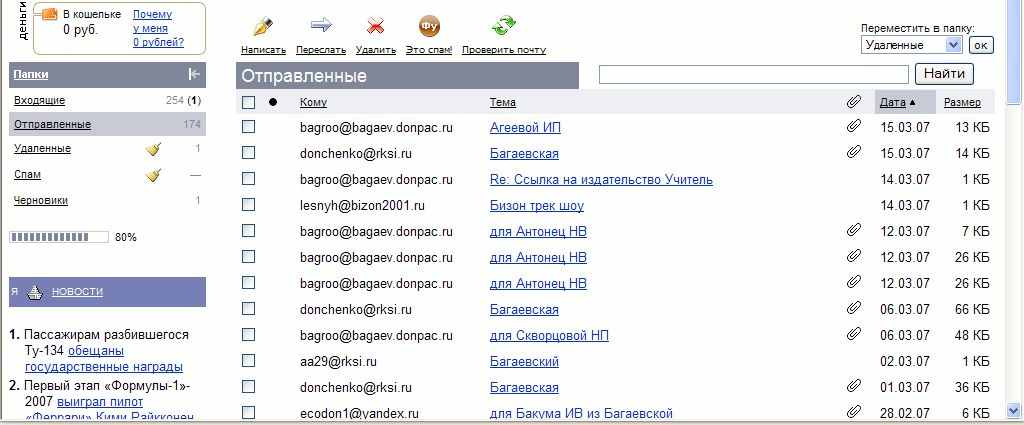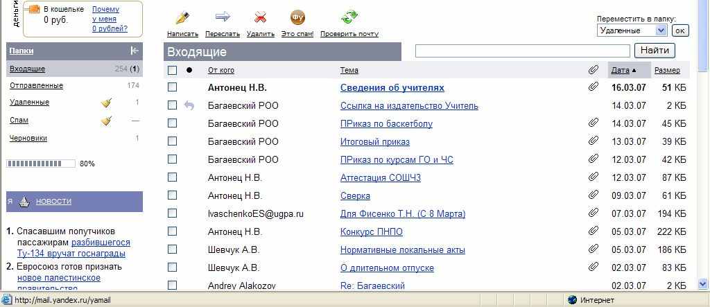 Входящая и исходящая папка нашего школьного почтового ящика: