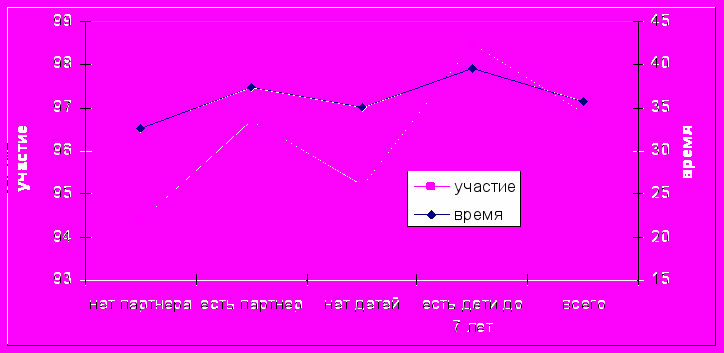 Рис. 3. Участие населения в домашнем труде и среднее время, затраченное на него, в зависимости от семейного положения и наличия детей дошкольного возраста в семье, %, 2006 г.