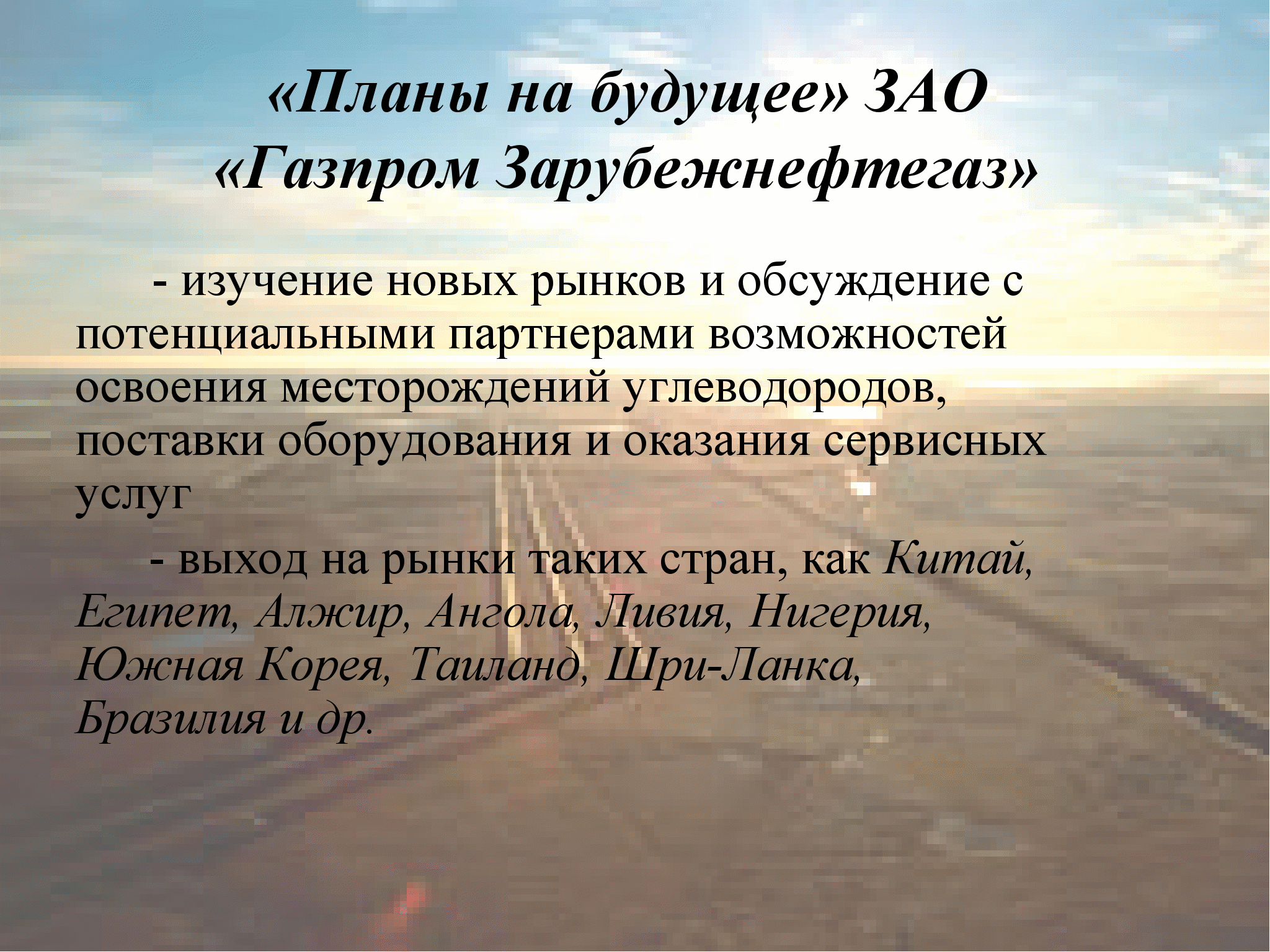 Рис 7. Планы на будущее ЗАО «Газпром Зарубежнефтегаз»