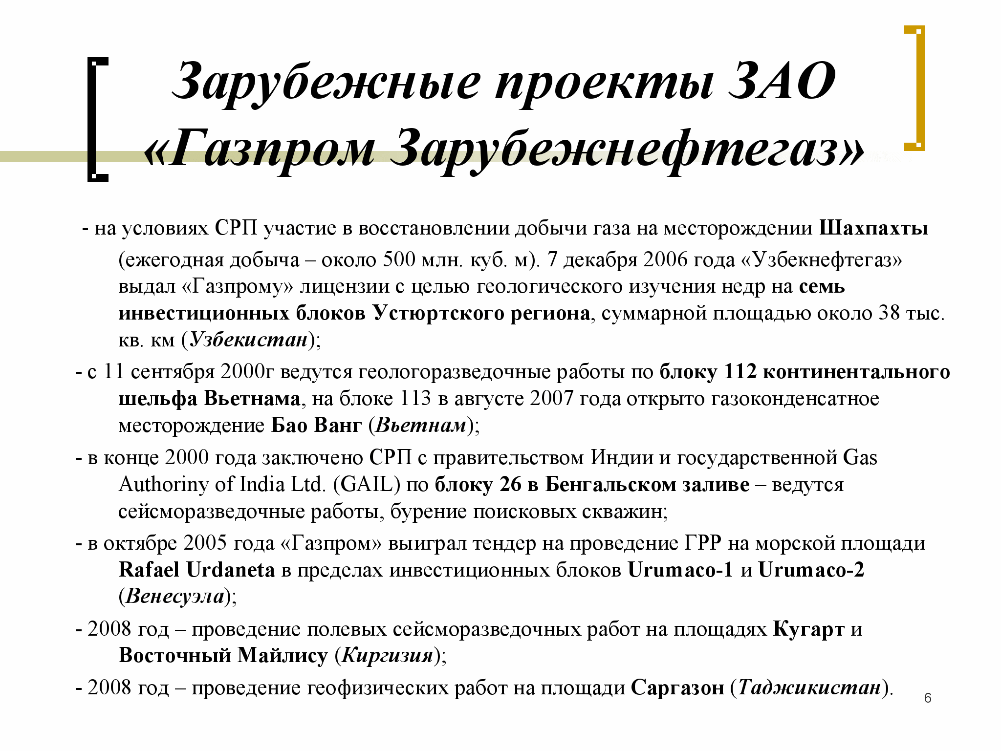 - на условиях СРП участие в восстановлении добычи газа на месторождении Шахпахты (ежегодная добыча – около 500 млн. куб. м). 7 декабря 2006 года «Узбекнефтегаз» выдал «Газпрому» лицензии с целью геологического изучения недр на семь инвестиционных блоков Устюртского региона, суммарной площадью около 38 тыс. кв. км (Узбекистан);