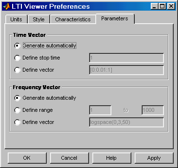 Векторы времени и частоты можно вычислять в автоматическом режиме (Generate automatically), ввести конкретное значение для времени окончания расчета (Define stop time) или диапазон значений по частоте (Define range), либо задать непосредственно вектор значений времени или частоты (Define vector).