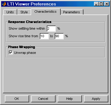 3. Установка параметров расчета переходного процесса (вкладка Characteristics). Данная вкладка позволяет задать параметры установленные "по умолчанию" для вычисления времени нарастания и времени переходного процесса. По умолчанию Simulink LTI-Viewer вычисляет время переходного процесса как время, когда переходная функция входит в 2% зону и больше не выходит из нее (параметр Show setting time within). Также можно изменить параметры для вычисления времени переходного процесса (Show rise time from). На данной вкладке имеется также флажок Unwrap phase, установка которого позволяет избежать отображения разрывов в фазо-частотной характеристике, связанных с областью определения функции arctg, вычисляющей фазовый сдвиг. Внешний вид вкладки Characteristics показан на рис. 11.8.