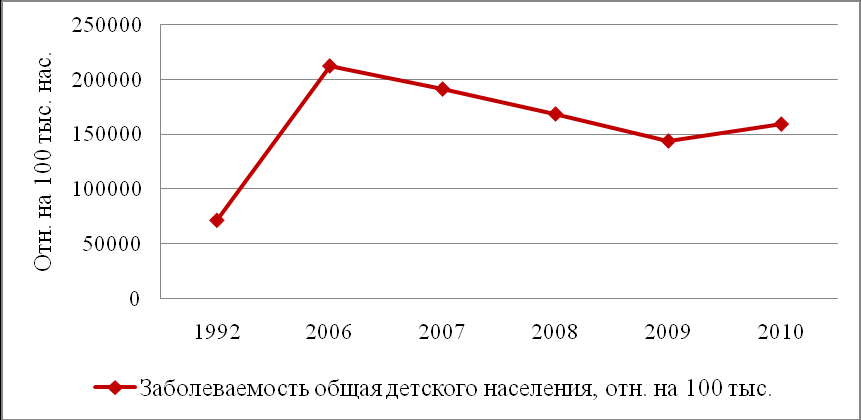 Расчетная дополнительная заболеваемость детского населения с 1992 г. по 2006 г. увеличились, а в 2007-2010 гг. снизилась (рис. 7), что также подтверждается статистическими данными общей заболеваемости детского населения пос. Каменск (рис. 8) (r = 0,88, р = 0,0207 при n = 6).