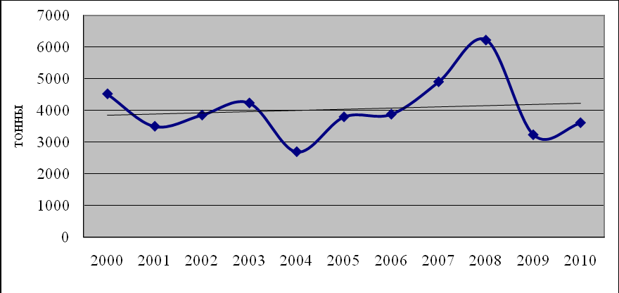 Рис. 2. Динамика выбросов загрязняющих веществ от стационарных источников пос. Каменск в 2000 – 2010 гг.