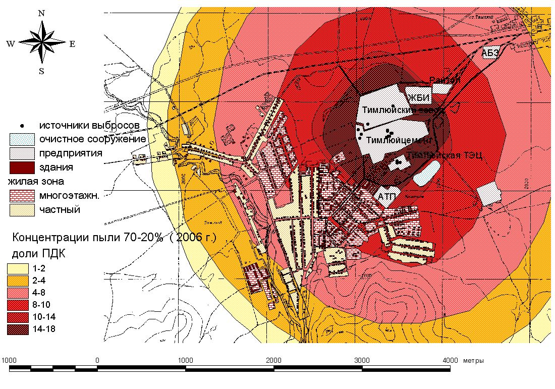 Согласно сводному проекту нормативов ПДВ для пос. Каменск (Столбиков и др., 1993) максимальные разовые концентрации суммарной пыли в атмосферном воздухе селитебной зоны превышали ПДКм.р. в 4,86 раза, азота диоксида – в 1,02 раза. Нами тоже проведены сводные расчеты рассеивания выбросов загрязняющих веществ в приземном слое атмосферы от приоритетных предприятий пос. Каменск при помощи УПРЗА «Призма-регион» версии 3.0. (ЗАО НПП «Логус»). На векторной карте пос. Каменск в геоинформационной системе (ArcView GIS 3.2.) отображены промышленные площадки, источники выбросов загрязняющих веществ в атмосферу, жилые дома с численностью населения, значения расчетных максимальных разовых концентраций. До внедрения природоохранных мероприятий имелись превышения гигиенических нормативов ПДКм.р. по пыли неорганической: 70-20% SiO2 на всех рецепторных площадках, достигая максимального значения 18,3 ПДК в ближайшей к предприятиям (до 300 м) жилой зоне (рис. 3). Основным загрязнителем атмосферы пылью неорганической: 70-20% SiO2 является ООО «Тимлюйский цементный завод» - 16,76 ПДК (91,7%). Выбросы Тимлюйской ТЭЦ тоже создают превышения до 1,3 ПДК. Превышения концентраций пыли неорганической: < 20 % SiO2 от общих выбросов достигают 2,07 ПДК. Имеется превышение диоксида азота до 3,76 ПДК.