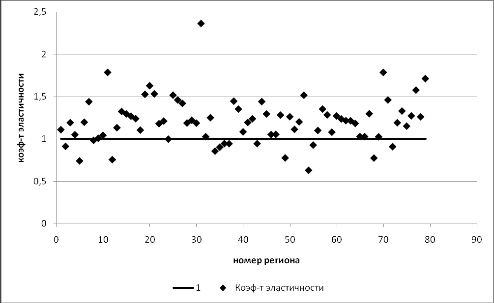 Как видно из графика на рис. 6, у подавляющего большинства регионов коэффициент эластичности оказался больше единицы, что означает опережающее увеличение объема платных медицинских услуг по сравнению с ростом доходов населения.