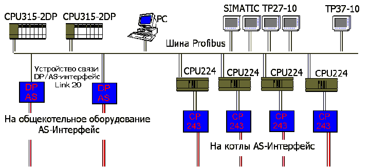К каждому котлу отходит по одному лучу AS-i, а общекотельное оборудование подключается двумя лучами (первый луч последовательно соединяет ЩУП.ХВО, ЩУП.СУ и щит управления оборудованием ХВО; второй – ЩУП.ГРУ/РОУ/РУ, ЩУП.ГУ и ЩУП.ДПУ).